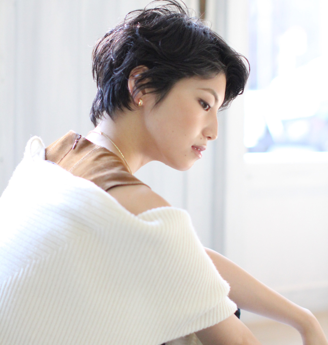 シンプルなベリーショートスタイルは、黒髪を生かすことによってボーイッシュな印象が強くなります。