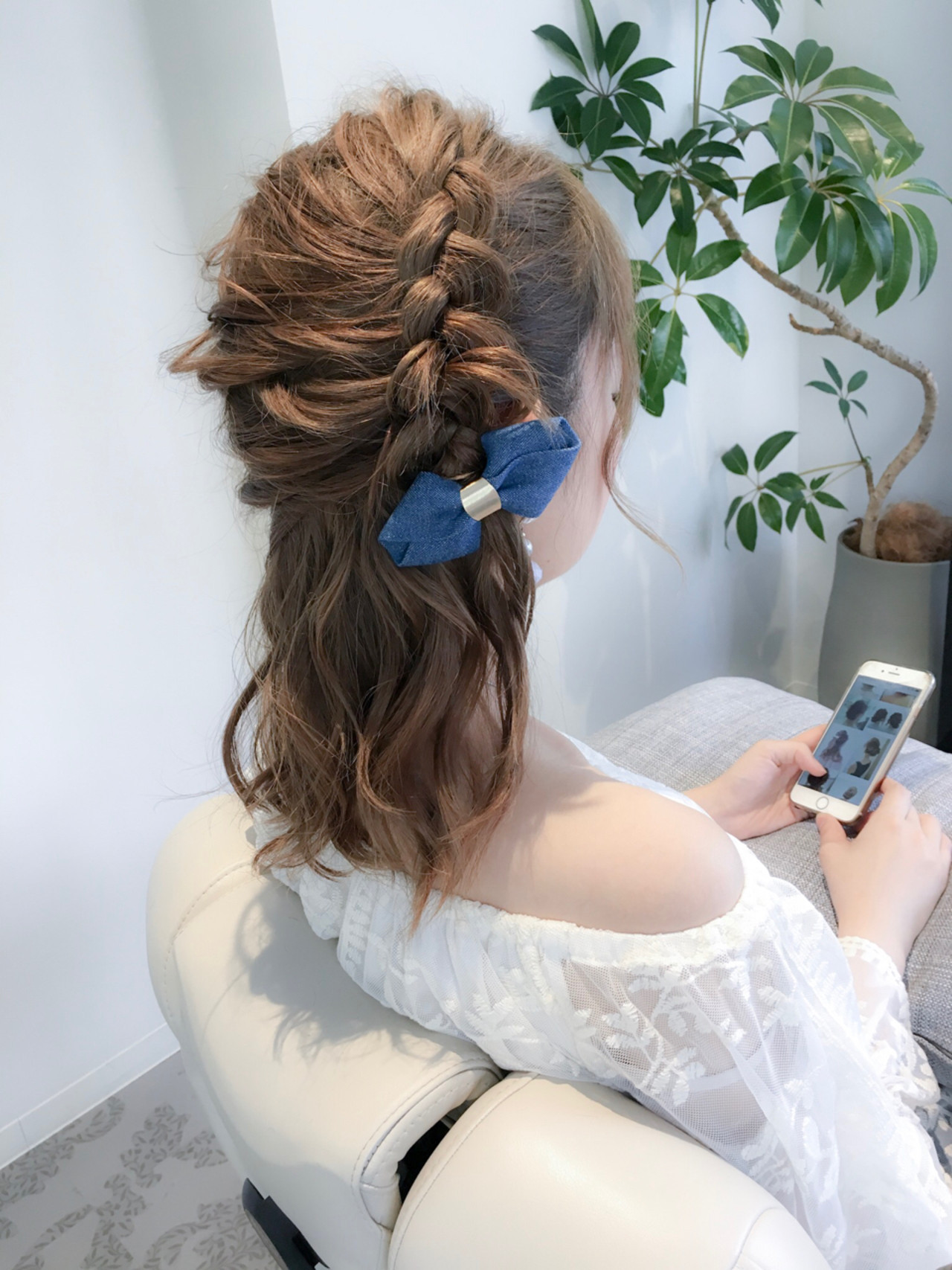 こちらはサイドを軽く編み込んで、後ろでハーフアップにしているスタイルです。