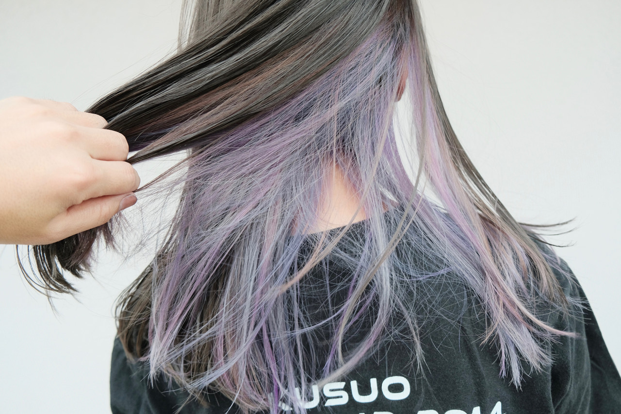 ミステリアスなハイトーンパープルアッシュをインナーカラーにしているスタイルです。クールビューティーな雰囲気をつくり出せますよ。