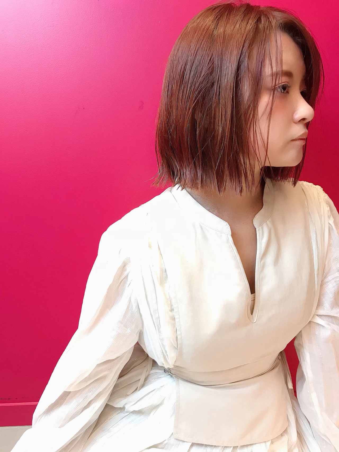 女子にも男子にも人気の高い旬な切りっぱなしボブ。重くなりがちなスタイルですが、ヘルシーなオレンジカラーをオンして、軽やかな印象に。