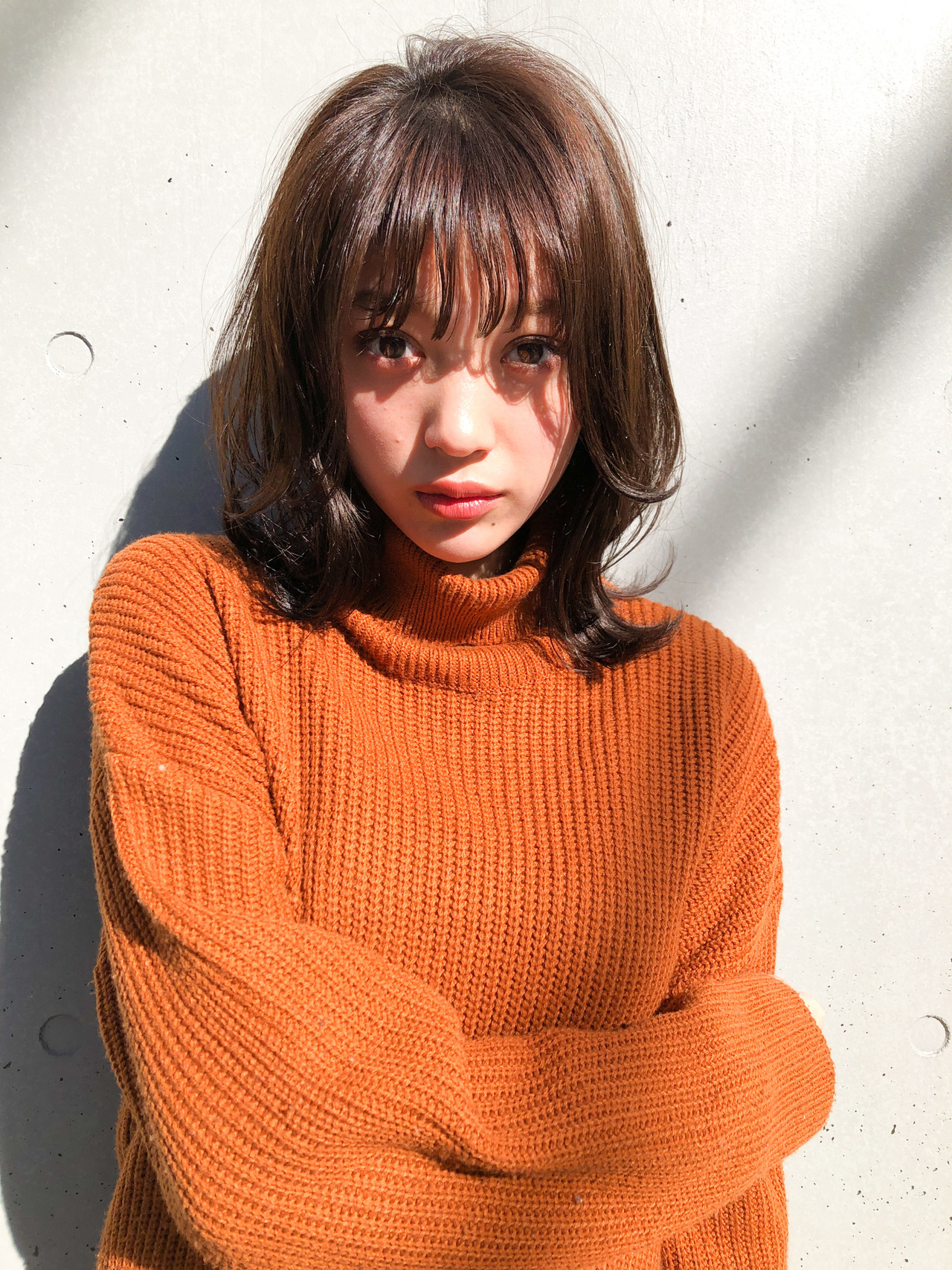マッシュベースの丸いシルエットの可愛さに、ウルフヘアのクールさをミックスしたスタイルです。トップをふんわりさせて、毛先に動きを出すことで顔をスッキリ見せます。ミディアムスタイルだと首まわりが華奢に見えることで女性らしさも演出してくれます。
