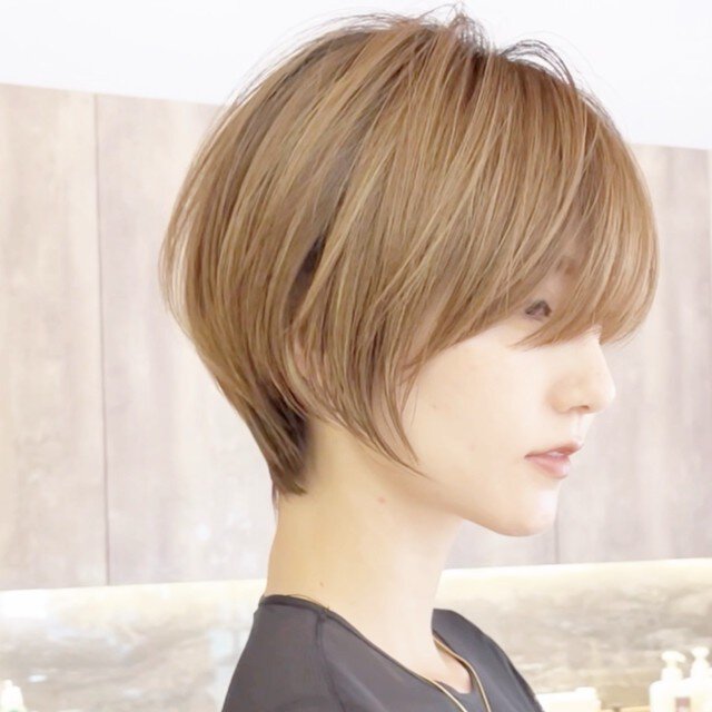 「ハイトーンのショートは顔が大きく見えそう…」と不安な方でも大丈夫。例えば丸顔さんの場合、長めの前髪をサイドに流してフェイスラインを自然に隠し、襟足をキュッとタイトに引き締めるカットラインがおすすめです。ハイトーンの明るさで視線が上に引き上げられるため、輪郭をスッキリ見せつつ、洗練された大人っぽい印象に仕上がります。