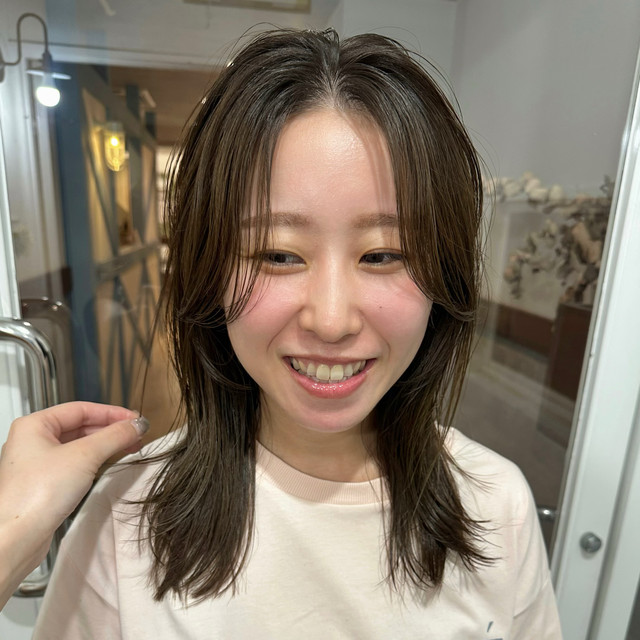 丸顔 無造作パーマ 前髪パーマ ミディアムレイヤー