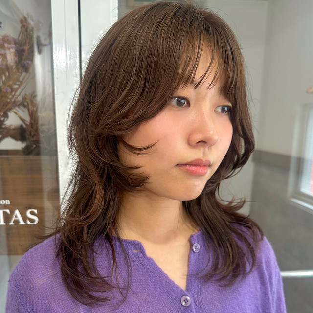 丸顔 無造作パーマ 前髪パーマ ミディアムレイヤー