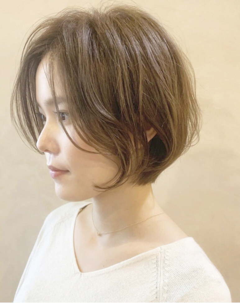 耳にかけることで雰囲気を変えることができる、透明感のある丸みショート。 髪質、骨格を問わず挑戦しやすいスタイルです。 クセの強い方はデザインストレートがオススメ。